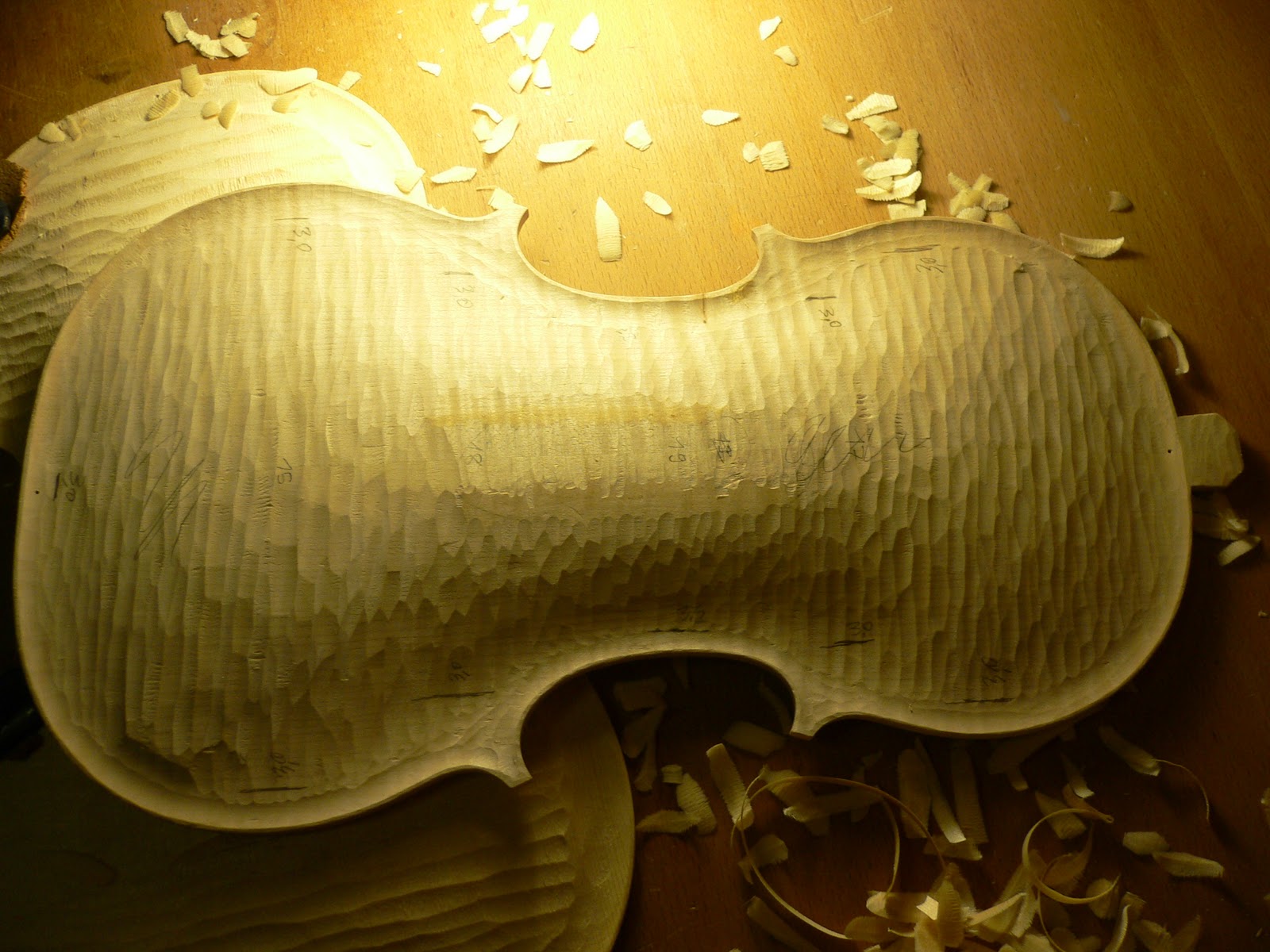 With the marking gauge, I marked the edge thickness of 6 mm all around the plates and carved the rough arching starting from the gauge mark. Then, using the ribstructure as a reference I finished the outline and corners.
